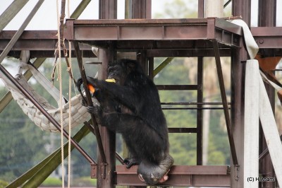 飼育下チンパンジー達も、同様に高いところを利用し、彼らの本来の能力や欲求が充分に発揮できるよう、放飼場にタワーが建設されたり、植樹されたりします。