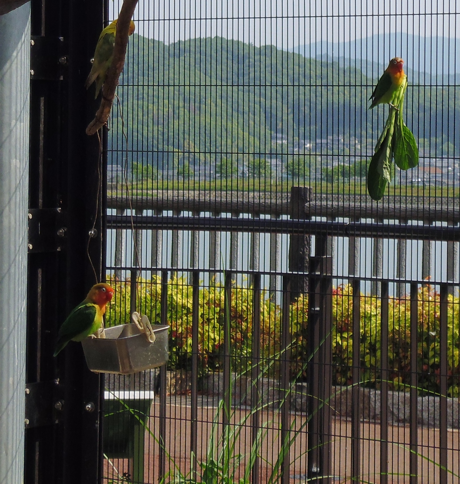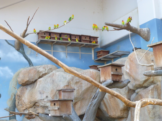 福山市立動物園の小動物舎は生息地ごとに4ゾーンに分かれていて、その1つのケープハイラックスとボタンインコの展示場には擬木や擬岩、巣箱が設置されています。