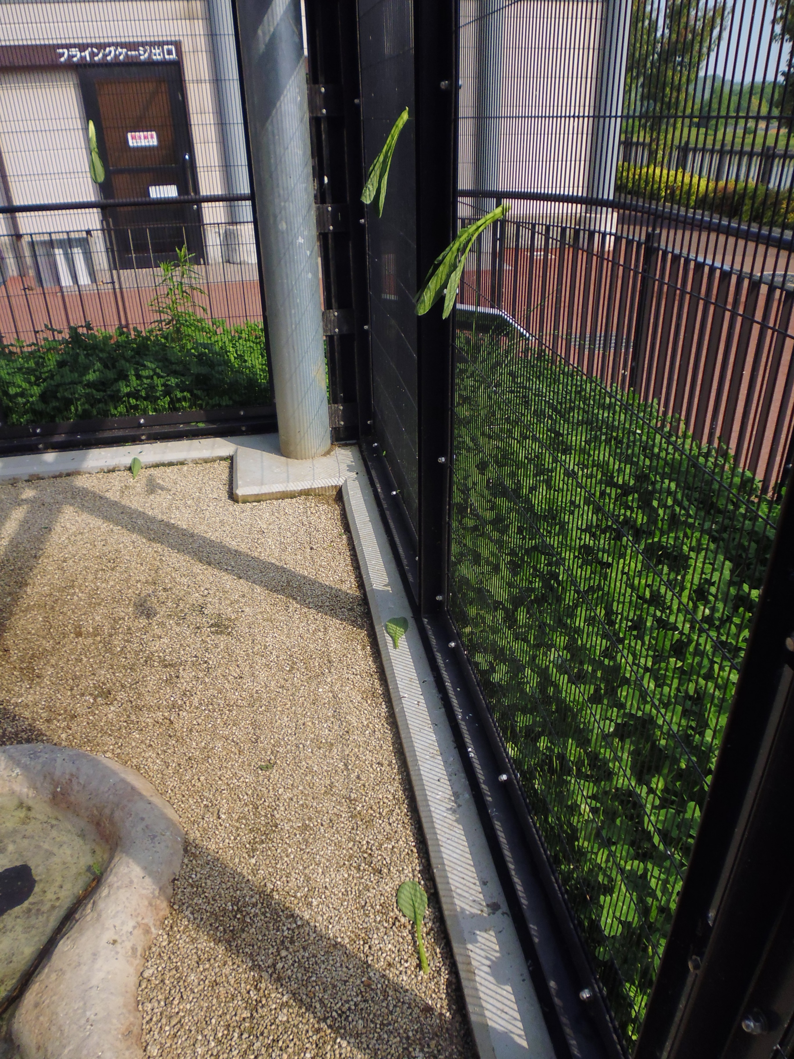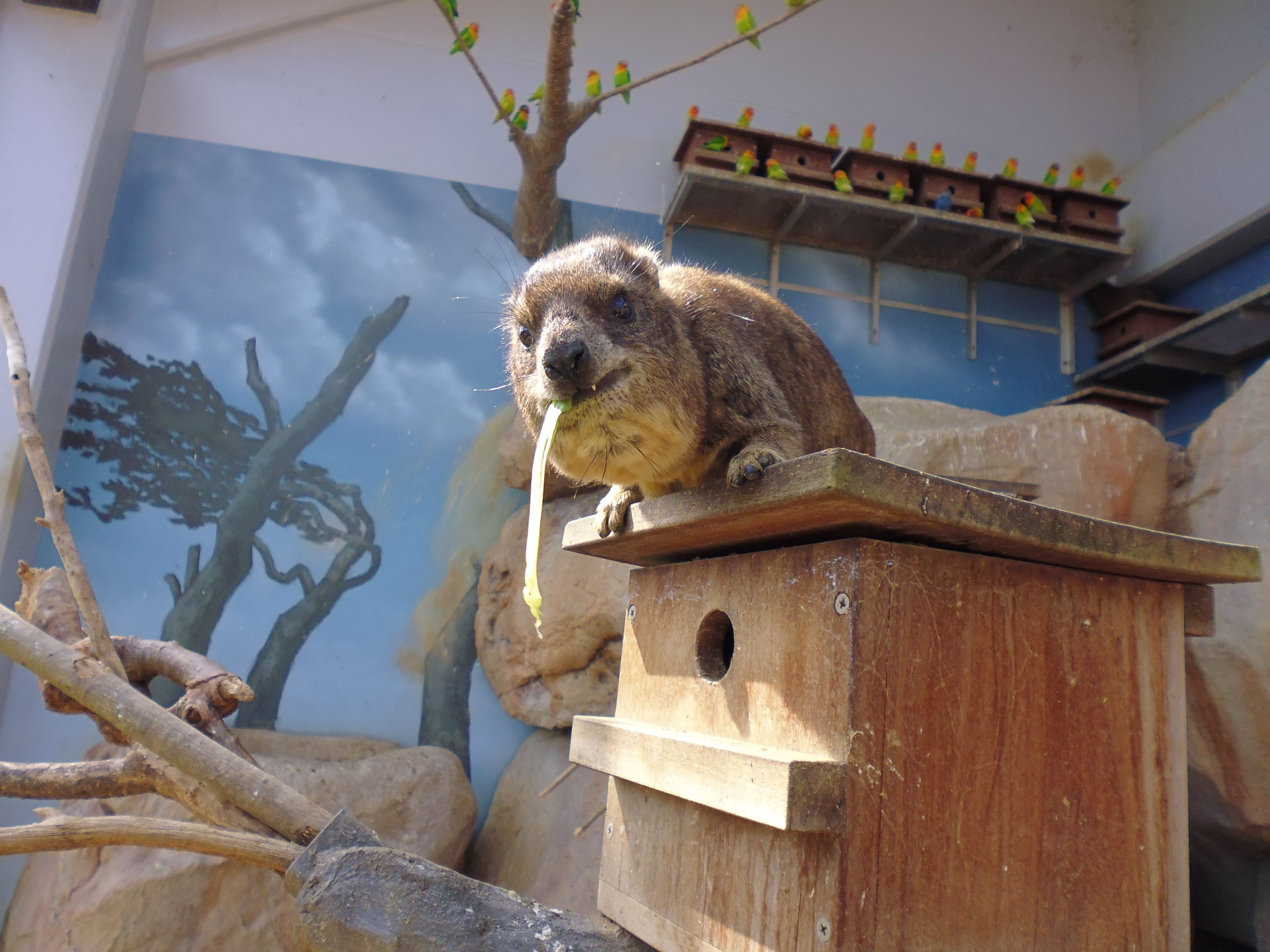 ここにはハイラックスが4頭とボタンインコが約70羽飼育され、夜間はハイラックスのみ屋内寝室へ移動します。