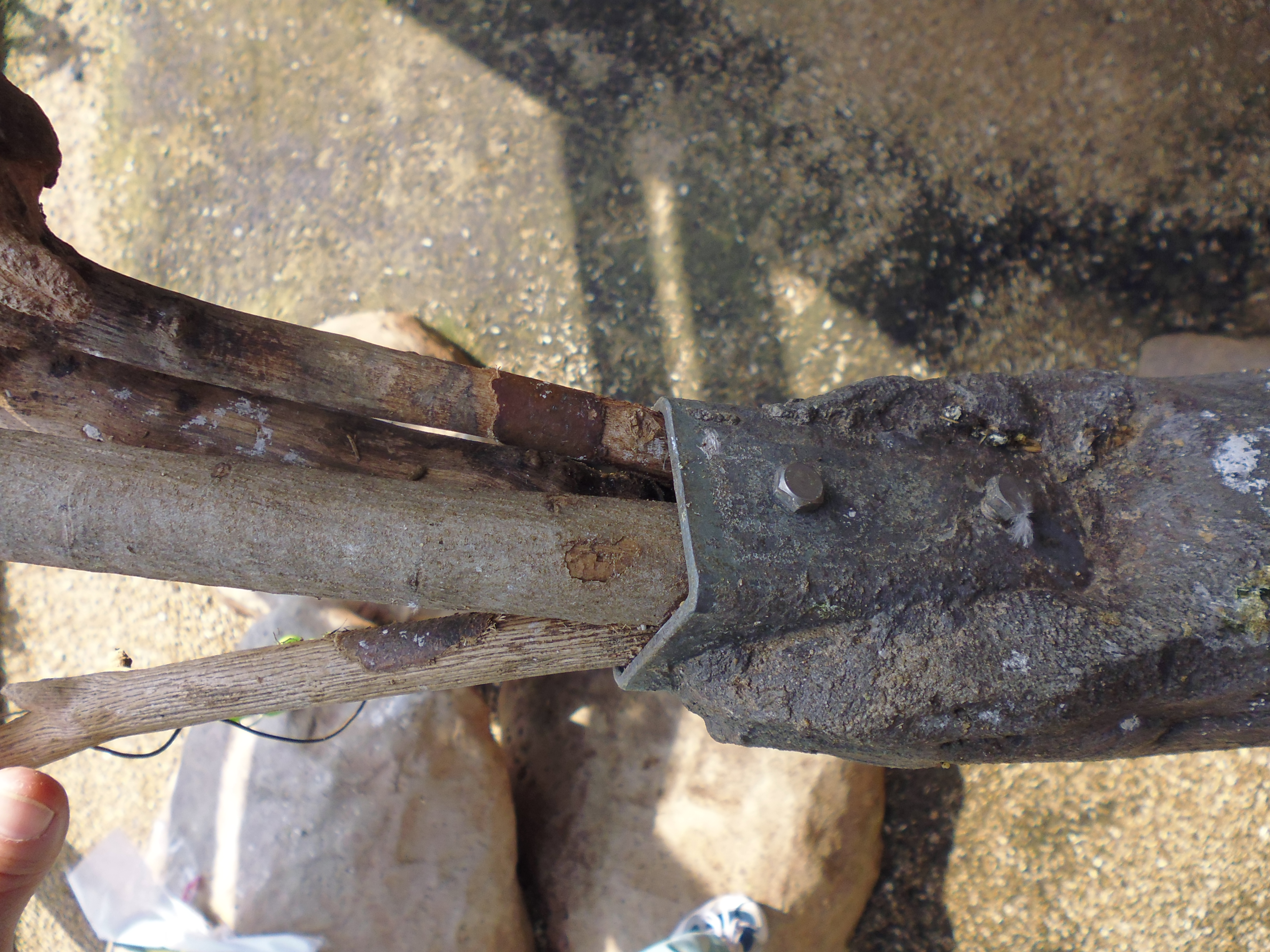 次に、擬木にカシの木を設置します。擬木には差し込み口があり、木を差しこんだ後、固定用のボルトで枝を固定します。