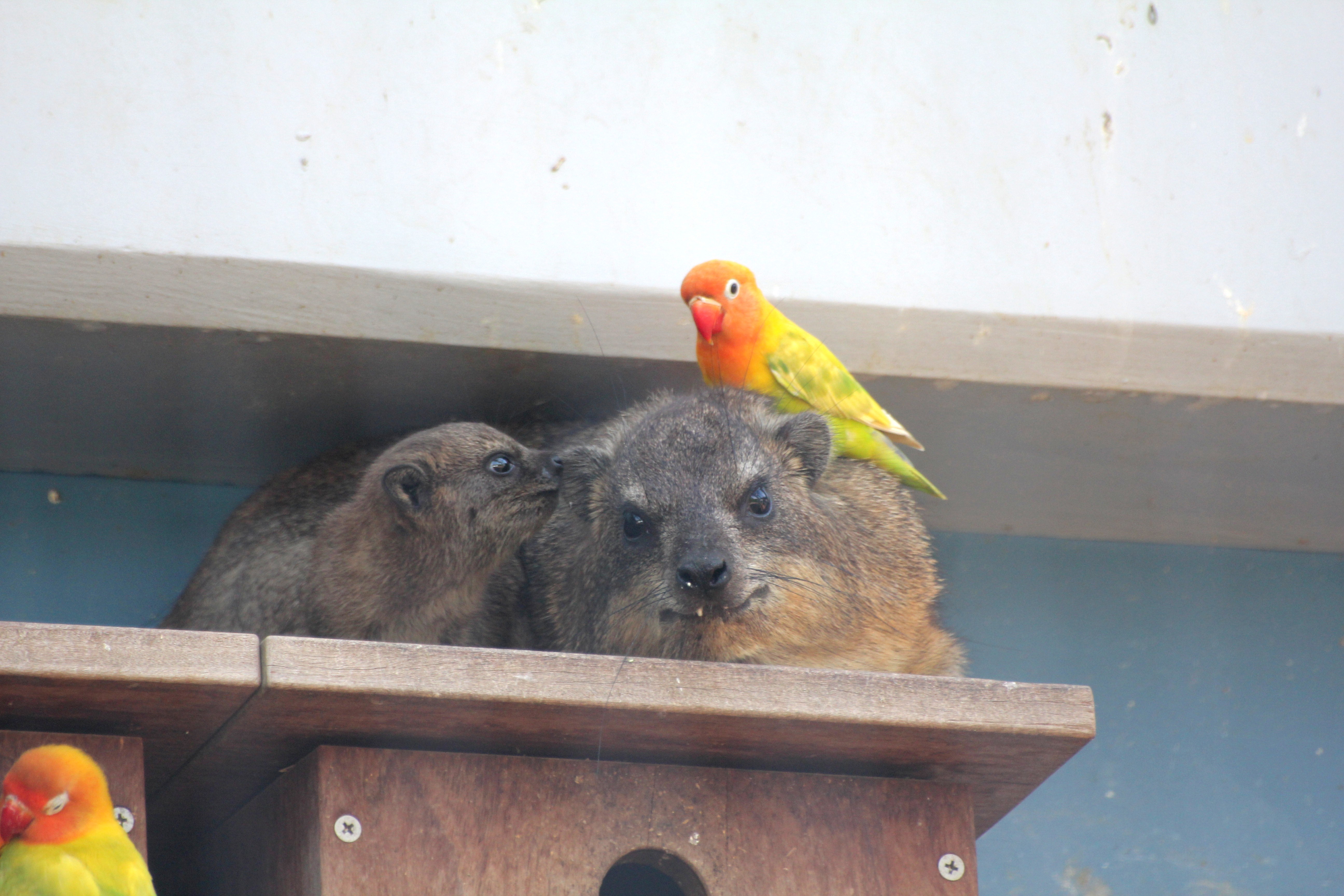 ・種名:ケープハイラックス(Procavia capensis)、ボタンインコ(Agapornis lilianae)