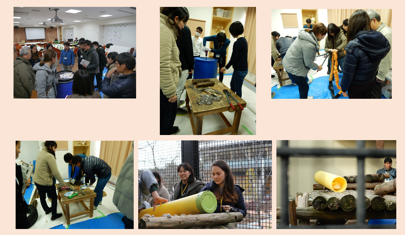 それぞれ完成したアイテムは、動物担当の岡部さん、そして管理職の方々からの安全チェックを受けます。そして、okが出た班から放飼場内に設置しました!現場での設置作業中には,多くの来園者の方々も興味深そうにその様子をのぞきこんでました。ワークショップ参加者にとっては、普段の動物たちが置かれている状況を体感する機会にもなりました。