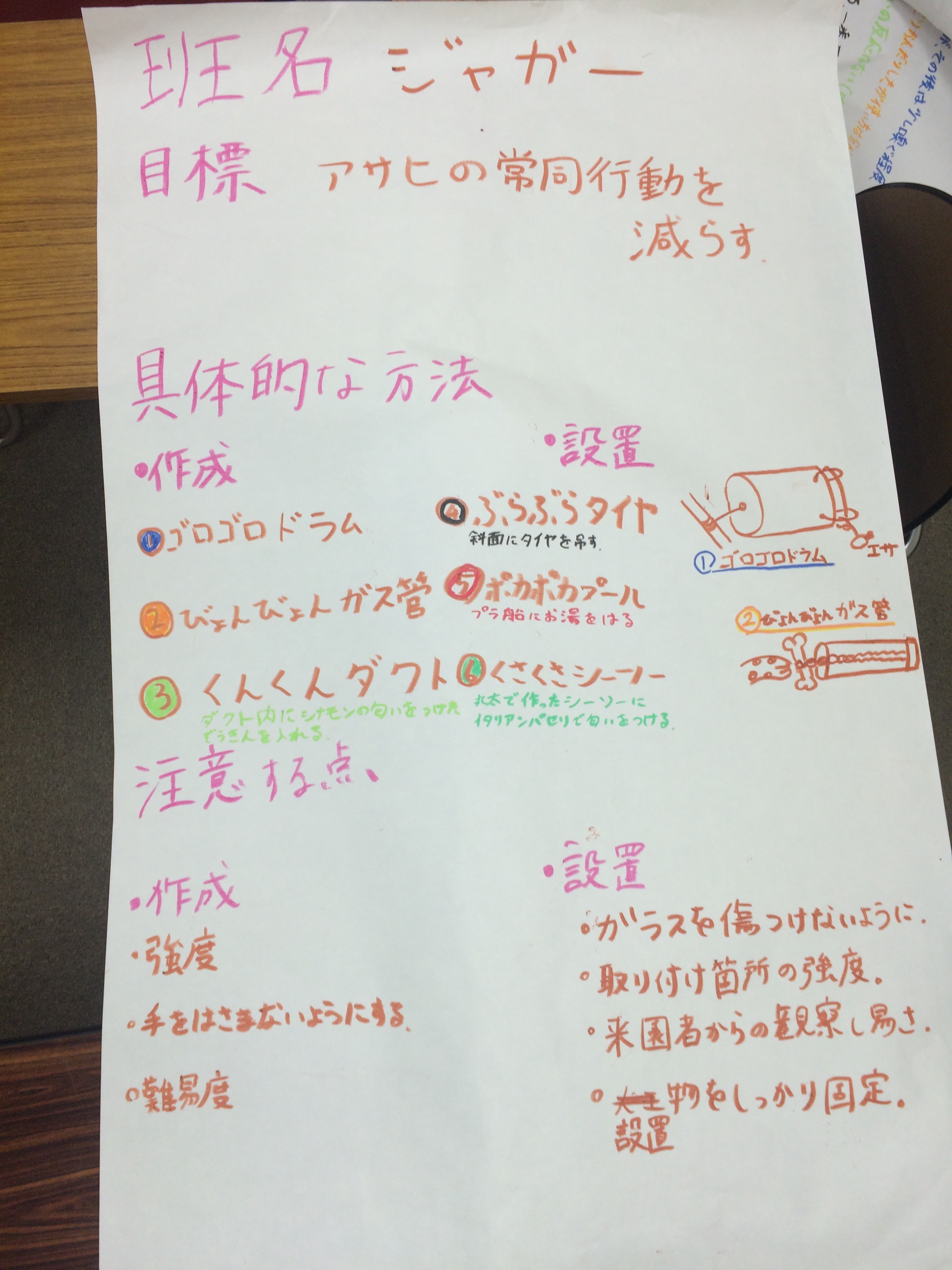 ジャガー班は,常同歩行をなくしたい!という目標を第一に掲げ,プラスチックドラム,丸太,ガス管,タイヤなどの材料を用いて,なんと計6個のアイテムを製作していました。