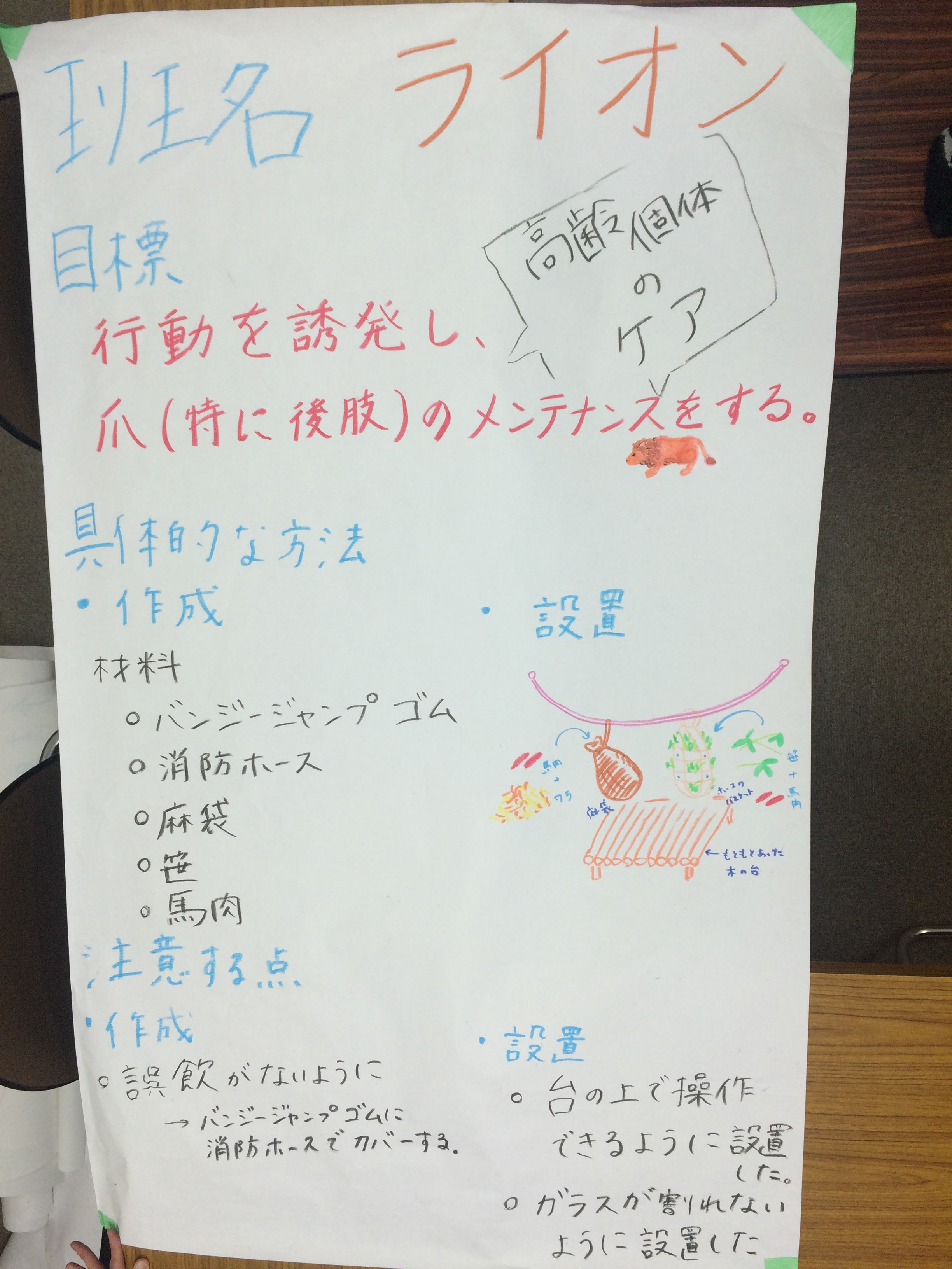 ライオン班では,対象が老齢個体であったことから、爪のケアを主眼としながらも,来園者の目の前で動く姿を見せるという展示効果も目標に加えました。消防ホースや麻袋を用いて作製したフィーダーをほどよい高さに吊るすことて,しがみついたライオンの後肢に力が入り、それにより爪の利用を促すというアイディアです。